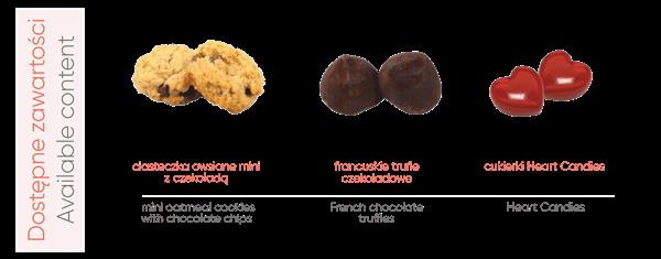 10 cukierków Heart Candies o smaku wiśniowym (łącznie 30 g)|2 francuskie trufle czekoladowe (łącznie 16 g)|6 ciasteczek owsianych mini z czekoladą (łącznie 24 g)