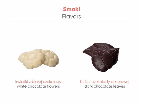 Botanic Sweetie Bag to ekologiczne słodycze reklamowe, które idealnie łączą smak i elegancję z troską o środowisko. W skład zestawu wchodzą czekoladowe kwiatki z białej czekolady (36% masła kakaowego) oraz listki z deserowej czekolady (57% kakao).
