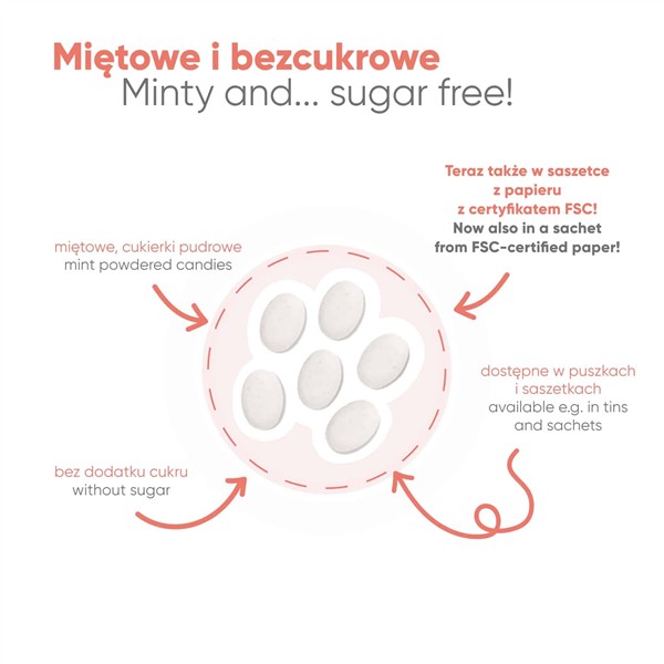 Odświeżający dodatek podczas przerwy kawowej w pracy? Miętowe pastylki pudrowe BEZ CUKRU w brandowanej saszetce! Pastylki odpowiednie są dla wegan.