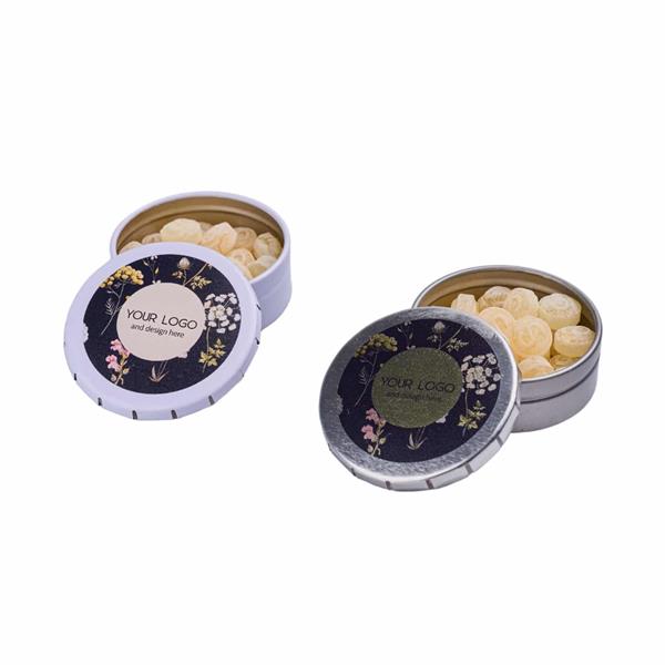 Kwiatowe mini karmelki z dodatkiem płatków kwiatów róży, czarnego bzu i lawendy, spakowane w stalową puszkę do ponownego wykorzystania w myśl zasady zero waste, to doskonały plan na słodką promocję Twojej marki!