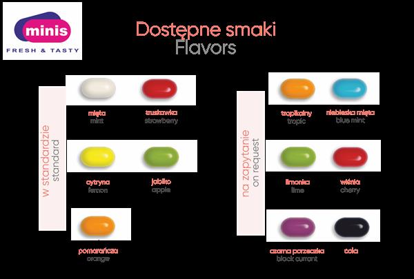 Polecamy też soczyście owocowy wariant – cukierki z dodatkiem soków owocowych. Dostępne są w 4 wersjach smakowych: jabłko, truskawka, pomarańcza i cytryna. Ich kolor i smak to zasługa naturalnych soków owocowych.