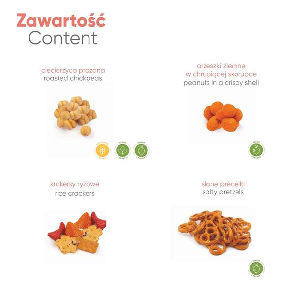 Słodycze reklamowe Snack Bag to połączenie smaku, jakości i ekologii w jednym małym opakowaniu. W środku znajdziesz starannie dobrane solone orzeszki ziemne (10 g) oraz chrupiące słone precelki (7 g) – idealne do dzielenia się podczas wydarzeń firmowych czy spotkań z klientami. To produkt, który nie tylko zaspokaja apetyt, ale również wzmacnia pozytywne skojarzenia z Twoją marką.
