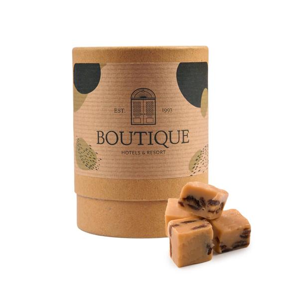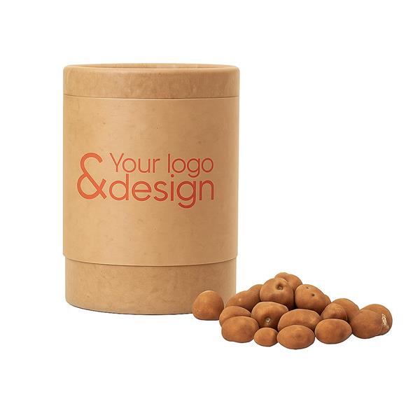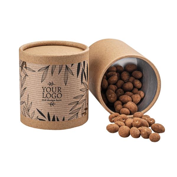 Wybrane słodkości zamykamy w kartonowej tubie wykonanej z papieru kraft i dodatkowo zabezpieczamy je folią kompostowalną. W pełni biodegradowalne opakowanie idealnie sprawdzi się więc jako gadżet dla marki, w której DNA wpisana jest ekologia.