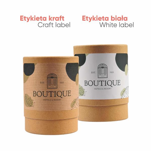 Opakowanie personalizujemy przy wykorzystaniu nadruku cyfrowego na etykiecie samoprzylepnej z papieru białego lub kraft.