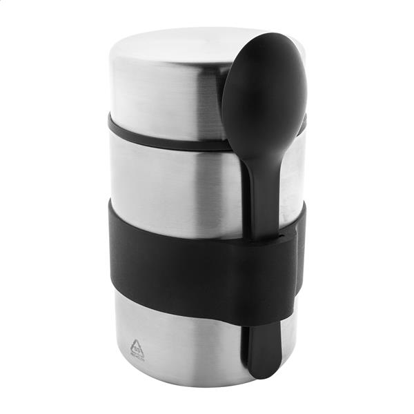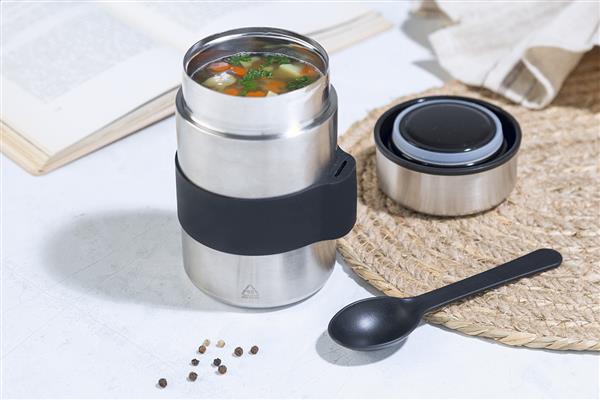 Pojemnik na lunch z podwójną ścianką, izolowany próżniowo, wykonany ze stali nierdzewnej z recyklingu, z silikonowym uchwytem i łyżką PP. Pojemność 450 ml.