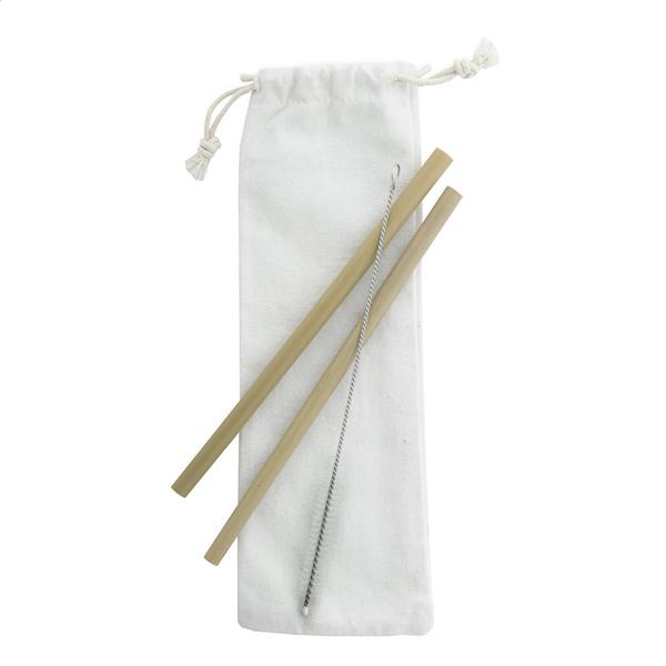Zestaw 2 bambusowych słomek wielokrotnego użytku i szczoteczki do ich czyszczenia w bawełnianym etui. Średnica i powierzchnia słomek mogą się różnić.
