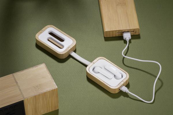 Słuchawki bezprzewodowe BAHO są obudowane w bambusowe etui zamykane magnetycznie. Dzięki swej ciekawej i nietypowej formie nikt nie przejdzie obok nich obojętnie. Wyposażone są w wskaźnik naładowania dzięki czemu nigdy nie zaskoczy Cię niski poziom baterii w urządzeniu. Dotykowe sterowanie słuchawek zapewnia wygodę użytkowania. Słuchawki posiadają wbudowany mikrofon, co pozwala na prowadzenie rozmów. Możliwość używania tylko jednej słuchawki. Dane techniczne: wersja Bluetooth: V5.1, zasięg Bluetooth: do 10m, pojemność baterii w każdej słuchawce: 30 mAh, pojemność baterii w etui: 200 mAh, czas pracy do 3 godz., port ładowania typu-c.