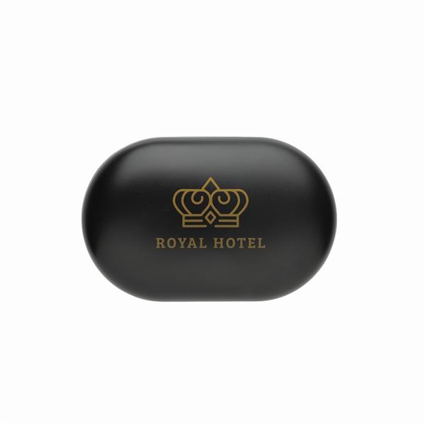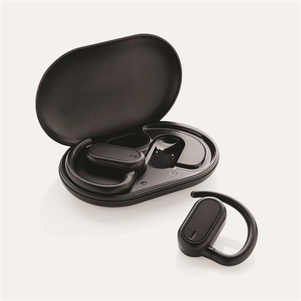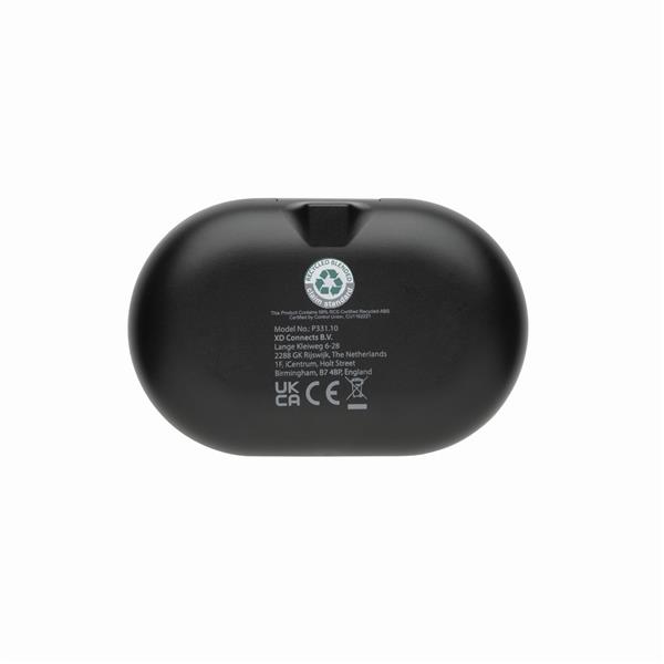 Słuchawki bezprzewodowe BT 5.3, wykonane z RABS z certyfikatem RCS (Recycled Claim Standard) produkt wyposażony w akumulator o pojemności 30 mAh, które można ponownie naładować w etui ładującym o pojemności 200 mAh w ciągu 1,5 godziny. Dzięki funkcji automatycznego parowania można je łatwo sparować z urządzeniem mobilnym, czas odtwarzania na średnim poziomie głośności wynosi ok. 5 godzin, zasięg działania do 10 metrów, z mikrofonem, w zestawie silikonowe końcówki douszne w 3 rozmiarach, kabel ładujący TPE z certyfikatem RCS, zapakowane w opakowanie FSC® mix kraft, produkt i akcesoria w 100% wolne od PVC