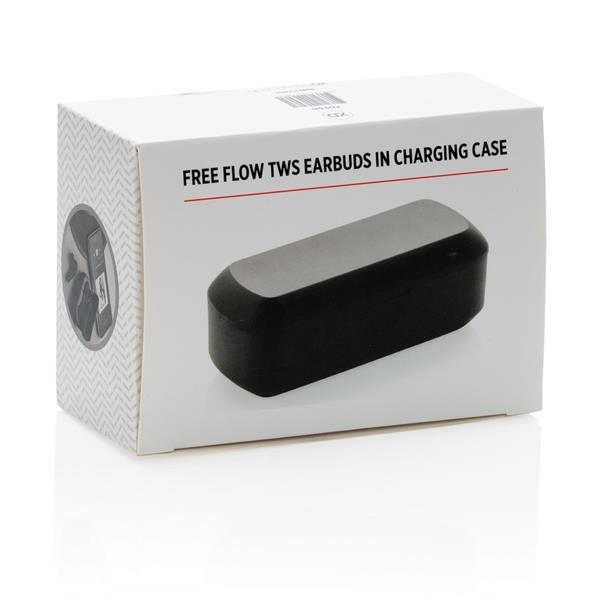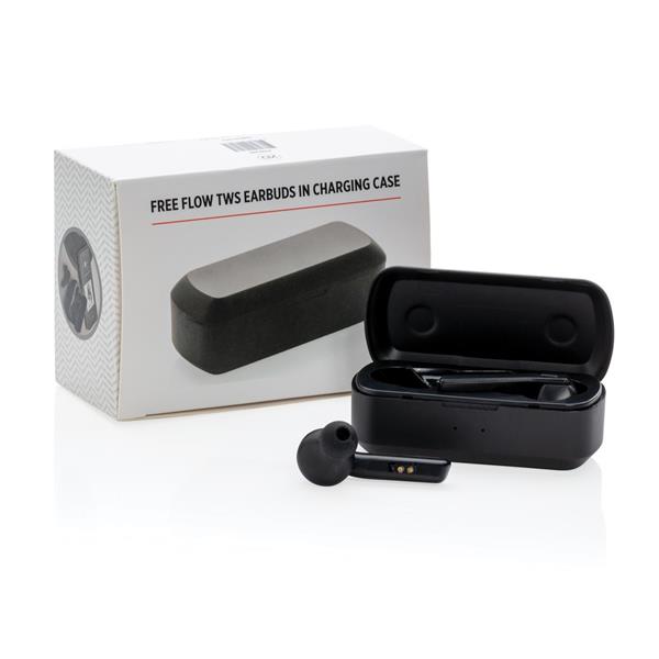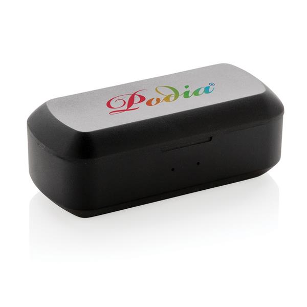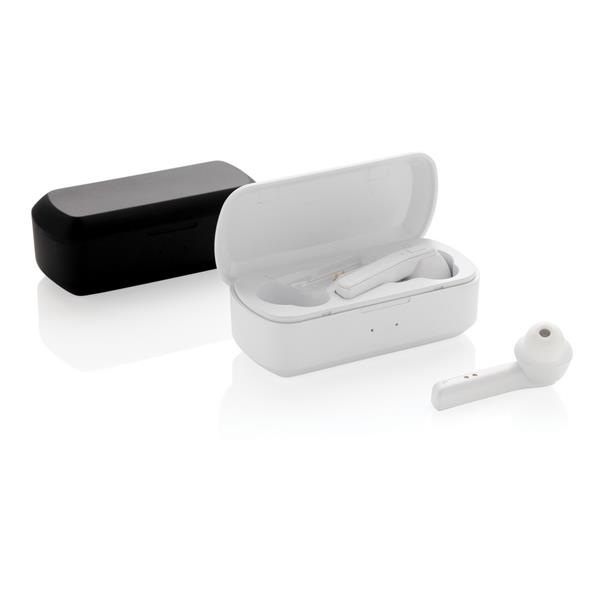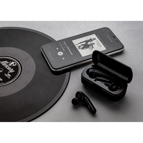Bezprzewodowe słuchawki douszne stereo, BT 5.0, wbudowany mikrofon, funkcja odbierania połączeń, wykonane z ABS etui z akumulatorem 500 mAh pełniące funkcję stacji ładującej w komplecie, akumulator słuchawek o pojemności 35 mAh umożliwia odtwarzanie muzyki na średnim poziomie głośności do 3 godzin, ponowne naładowanie za pomocą etui w 1 godzinę, zasięg do 10 m, 3 rozmiary nakładek dousznych w komplecie, ślad węglowy produktu: 0,79 kg CO2