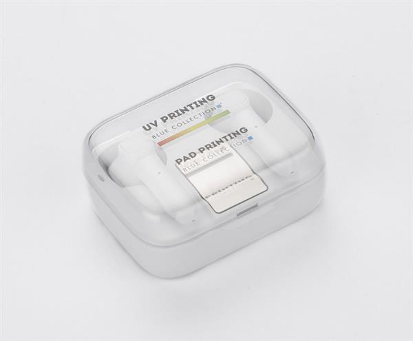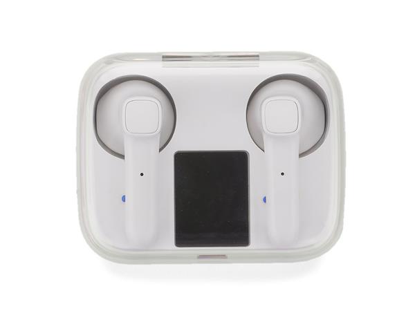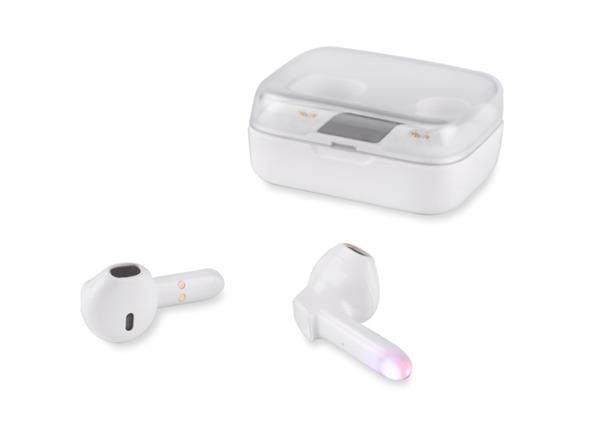 Słuchawki bezprzewodowe TRUVI to kompaktowych rozmiarów słuchawki douszne zapakowane w poręczne etui, które pełni jednocześnie funkcję akumulatora i umożliwia doładowanie urządzenia. Wyświetlacz LED pokazuje aktualny stan naładowania zarówno baterii w etui, a także każdej słuchawki. Dotykowe sterowanie słuchawek zapewnia wygodę użytkowania. Słuchawki posiadają wbudowany mikrofon, co pozwala na prowadzenie rozmów. Możliwość używania tylko jednej słuchawki. Dane techniczne: wersja Bluetooth: V5.1, częstotliwość Bluetooth: 2,4 – 2,48 GHz, zasięg Bluetooth: do 10m, pojemność baterii w każdej słuchawce: 30 mAh, pojemność baterii w etui: 300 mAh, czas pracy do 3 godz., czas czuwania: 300 godz.