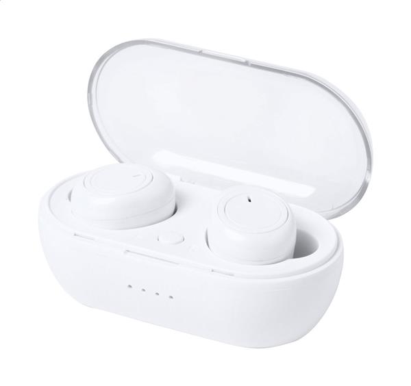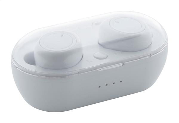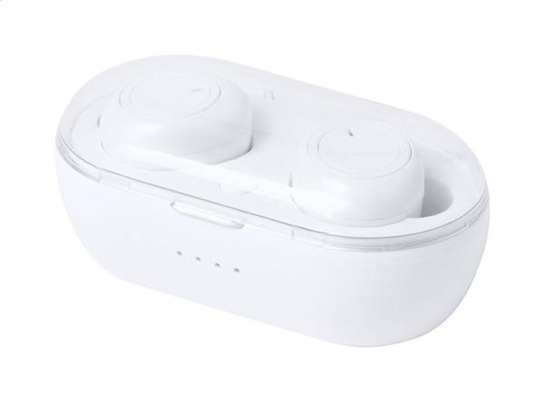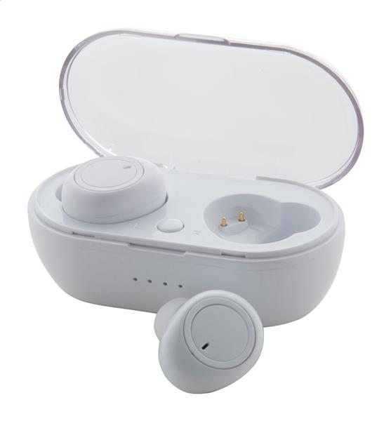 Prawdziwie bezprzewodowe słuchawki stereo (TWS) z funkcją zestawu głośnomówiącego w plastikowym etui z ładowarką. W zestawie kabel USB do ładowania.