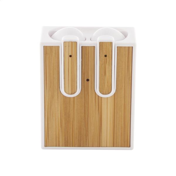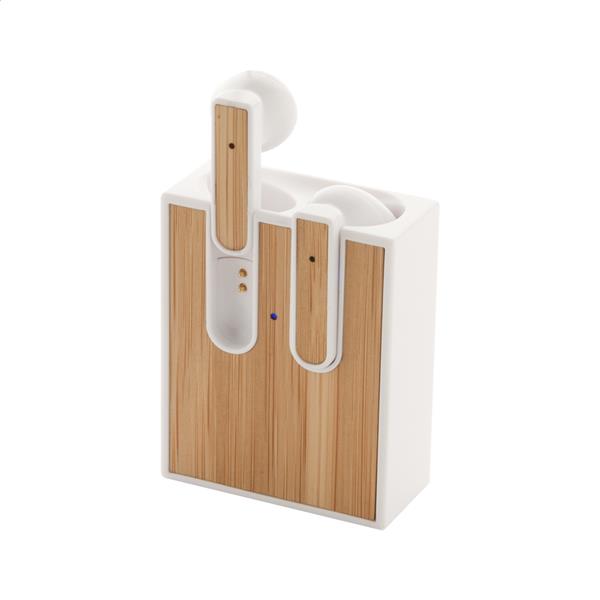 Prawdziwie bezprzewodowe słuchawki stereo (TWS) z bambusową wkładką i funkcją zestawu głośnomówiącego. W plastikowej obudowie ładowarki ABS z bambusową wkładką. W zestawie kabel USB do ładowarki.