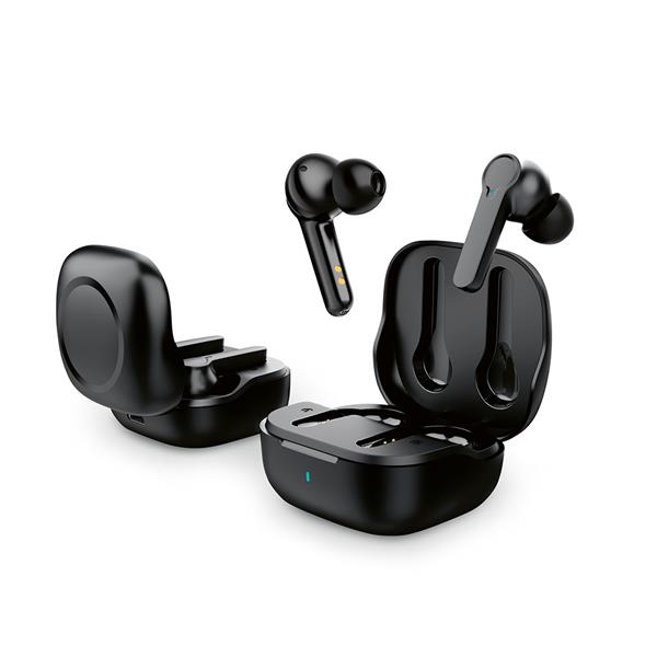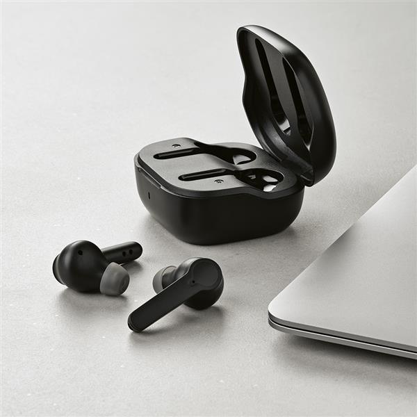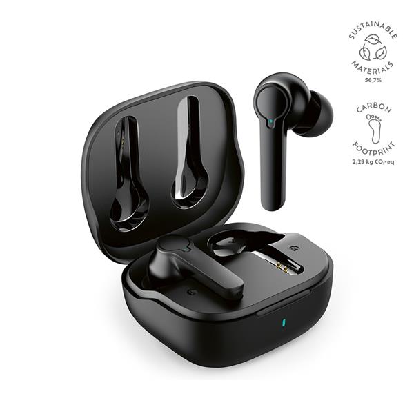 Innowacyjne, wykonane z przetworzonego rABS słuchawki douszne wyposażone są w ANC i wodoodporność IPX4. Wskaźniki LED pokazują poziom naładowania. Złącze USB-C gwarantuje wygodę i umożliwia ładowanie w 1,5 godziny. Korzystaj z 8 godzin odtwarzania dzięki baterii 500 mAh i zakresowi częstotliwości 20-20 kHz.