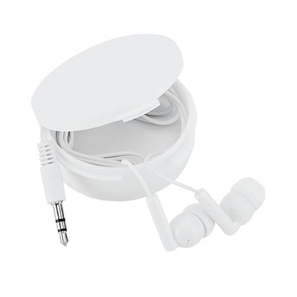 Słuchawki douszne zapakowane w plastikowe pudełko, z kablem 3,5 mm. Kolor: Biały T3 (tampodruk): 3 x 3 cm Rozmiar: 2 x 5,3 cm