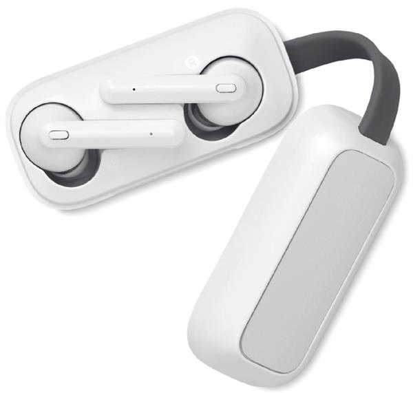 Zestaw 2 bezprzewodowych stereofonicznych słuchawek dousznych TWS 5.0 z mikrofonem i wbudowanym akumulatorem 30 mAh. Czas odtwarzania ok. 3 godziny. Automatyczne parowanie. W zestawie kabel do ładowania micro USB. Prezentowane w pudełku do ładowania bezprzewodowego, które działa również jako stacja ładująca z akumulatorem 400 mAh.