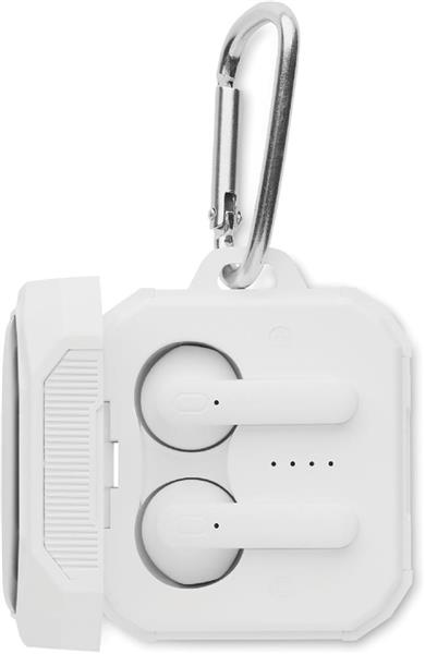 Bezprzewodowe słuchawki douszne ABS True Wireless Stereo (TWS) 5.3 z mikrofonem i karabińczykiem. Bateria 30 mAh. Czas odtwarzania ok. 4 godzin. Z baterią ładowaną energią słoneczną. Automatyczne parowanie. W zestawie kabel do ładowania typu C i stacja ładująca 200 mAh.