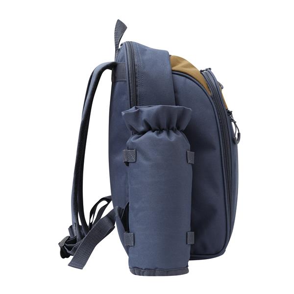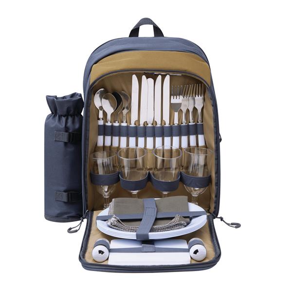 Plecak piknikowy SMART TRIP dla 4 osób. W zestawie znajdują się sztućce ze stali nierdzewnej z plastikowymi uchwytami, plastikowe szklanki i talerze, materiałowe serwetki, a także solniczka i pieprzniczka. Plecak posiada trzy zamykane na zamki błyskawiczne komory – główną, środkową i przednią. Dla wygody użytkowania ma również uchwyt do przenoszenia oraz miękkie szelki. Dodatkowo z boku wyposażony jest w odpinany schowek na butelkę.