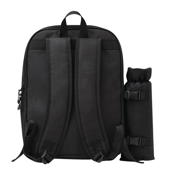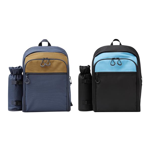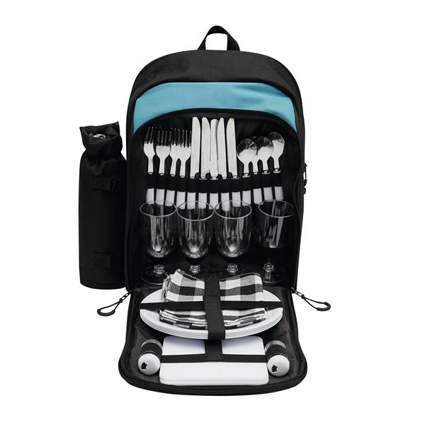 Plecak piknikowy SMART TRIP dla 4 osób. W zestawie znajdują się sztućce ze stali nierdzewnej z plastikowymi uchwytami, plastikowe szklanki i talerze, materiałowe serwetki, a także solniczka i pieprzniczka. Plecak posiada trzy zamykane na zamki błyskawiczne komory – główną, środkową i przednią. Dla wygody użytkowania ma również uchwyt do przenoszenia oraz miękkie szelki. Dodatkowo z boku wyposażony jest w odpinany schowek na butelkę.
