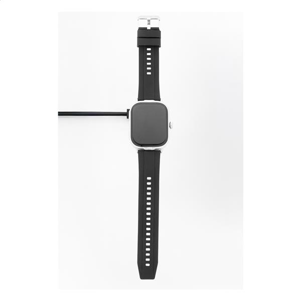 Wielofunkcyjny bezprzewodowy smartwatch w metalowej obudowie z 2,01-calowym ekranem dotykowym TFT, akumulatorem 210 mAh i silikonowym paskiem. Posiada kilka funkcji monitorowania zdrowia i inteligentnych funkcji, takich jak tętno, ciśnienie krwi i monitor tlenu, a także wiele innych. Może być połączony ze smartfonem za pomocą bezpłatnej aplikacji dostępnej dla systemów iOS i Android. W zestawie magnetyczny kabel USB do ładowania. Wodoodporność IP65.