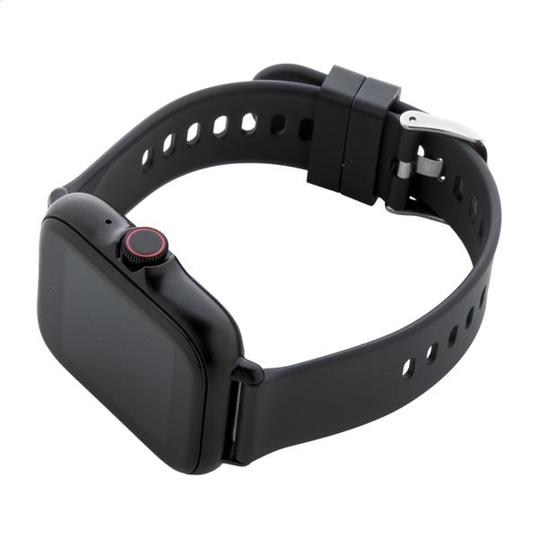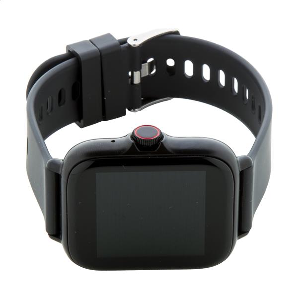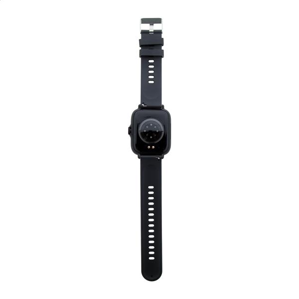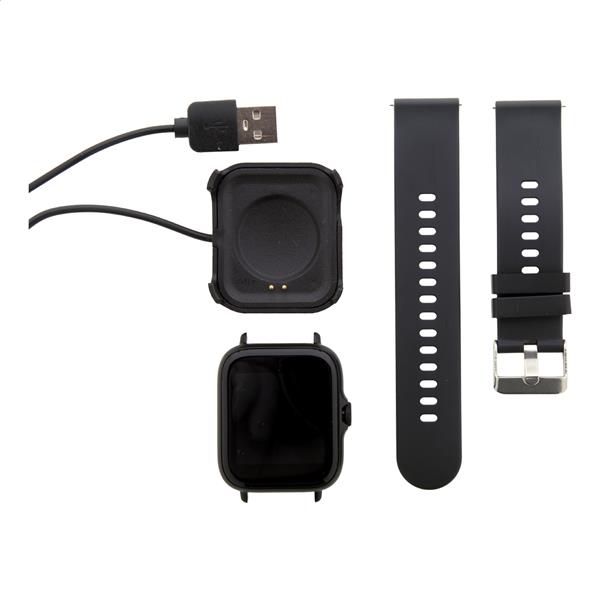 Wielofunkcyjny bezprzewodowy smartwatch w metalowej obudowie z 1,44-calowym ekranem dotykowym TFT, akumulatorem 150 mAh i silikonowym paskiem. Posiada kilka funkcji monitorowania zdrowia i inteligentnych funkcji, takich jak tętno, ciśnienie krwi i monitor tlenu, a także wiele innych. Może być połączony ze smartfonem za pomocą bezpłatnej aplikacji dostępnej dla systemów iOS i Android. W zestawie kabel USB do ładowania. Wodoodporność IP65.