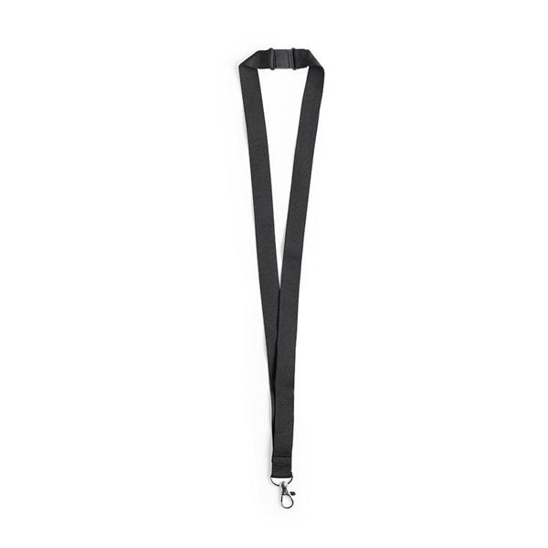 Smycz reklamowa, posiada rozpinany zatrzask bezpieczeństwa zapobiegający zaciśnięciu smyczy na szyi