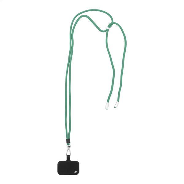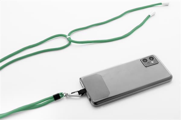 Smycz RPET z regulowanym uchwytem na telefon, metalowym karabińczykiem i wkładką na telefon.