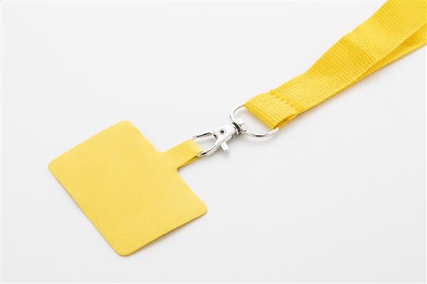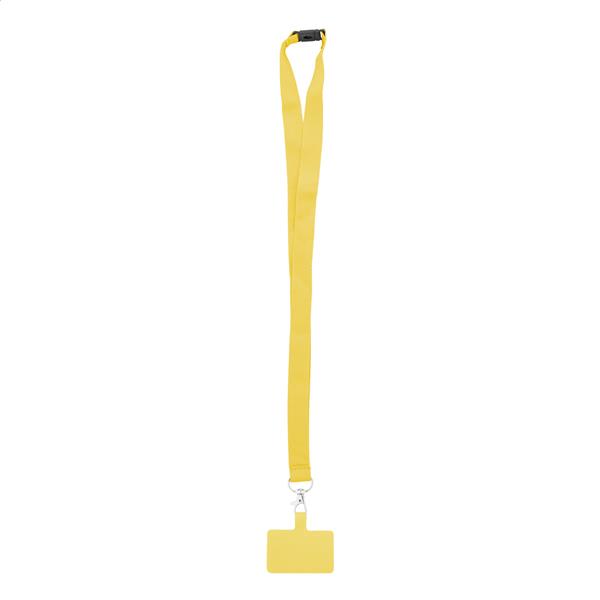 Smycz RPET do telefonu komórkowego z metalowym karabińczykiem, klamrą bezpieczeństwa i dopasowaną kolorystycznie wkładką na telefon.