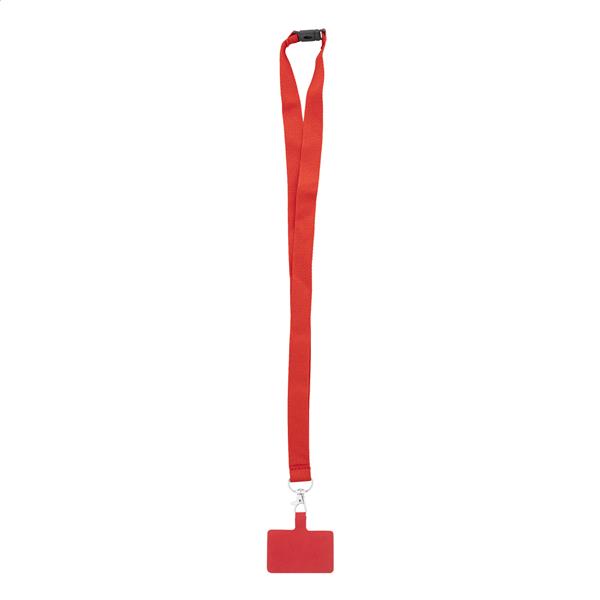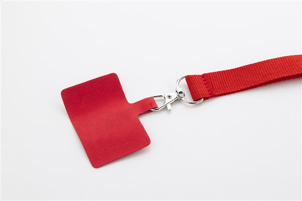 Smycz RPET do telefonu komórkowego z metalowym karabińczykiem, klamrą bezpieczeństwa i dopasowaną kolorystycznie wkładką na telefon.