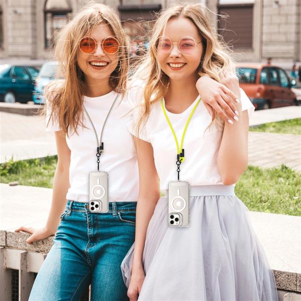 Wyposażony w adapter, który umieszczamy po wewnętrznej stronie etui, umożliwia bezpieczne i wygodne noszenie telefonu. Dzięki regulowanej długości sznurka, możemy przewiesić telefon przez ramię lub nosić go w dłoni, dostosowując sposób użytkowania do naszych potrzeb.