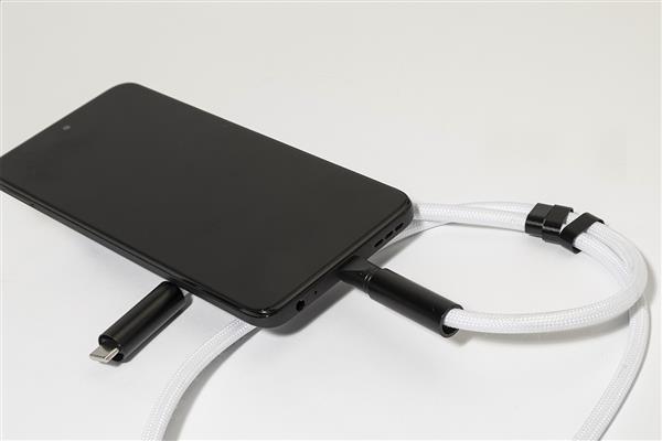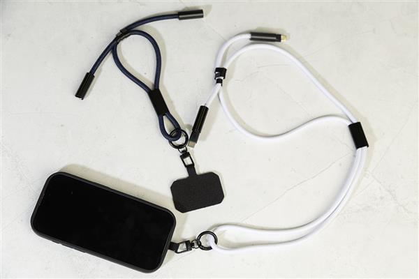 Smycz RPET do telefonu z uchwytem na telefon, karabińczykiem i zintegrowanym kablem ładującym USB-C do USB-C z ukrytymi złączami. Obsługuje szybkie ładowanie PD 60 W i transfer danych.
