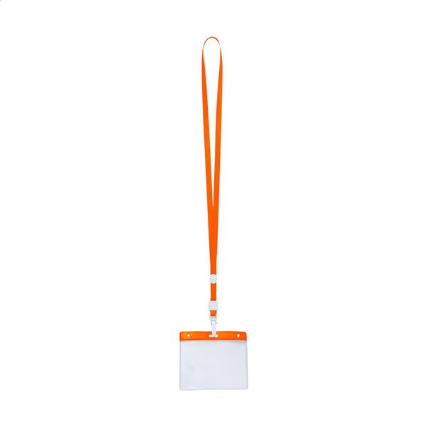 Poliestrowa smycz z plastikowym karabińczykiem i futerałem na wejściówkę.