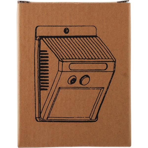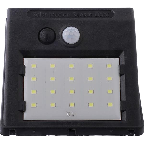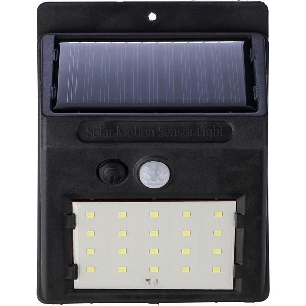 Solarna lampa ścienna LED z 20 diodami COB, wyposażona w czujnik zmierzchu (CDS) oraz czujnik ruchu (PIR), posiada wbudowaną baterię o pojemności 800 mAh, kabel do ładowania w zestawie, klasa szczelności IP44, funkcja światła stałego lub migającego, pakowana pojedynczo w brązowe kartonowe pudełko, produkt wykonany z PP