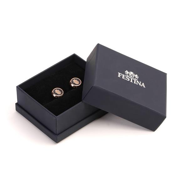 Nasze spinki do mankietów „Chronobike” są inspirowane kultowym przyciskiem stop zegarka Festina i zdobione charakterystycznym logo. Wykonane są ze stali nierdzewnej. Ta błyszcząca wersja z akcentami Rosegold, wykończona jest emalią w kolorze głębokiego granatu. To ponadczasowy klasyk. Rozmiar: Dia. 15 x 3 mm Kolor: Czarny