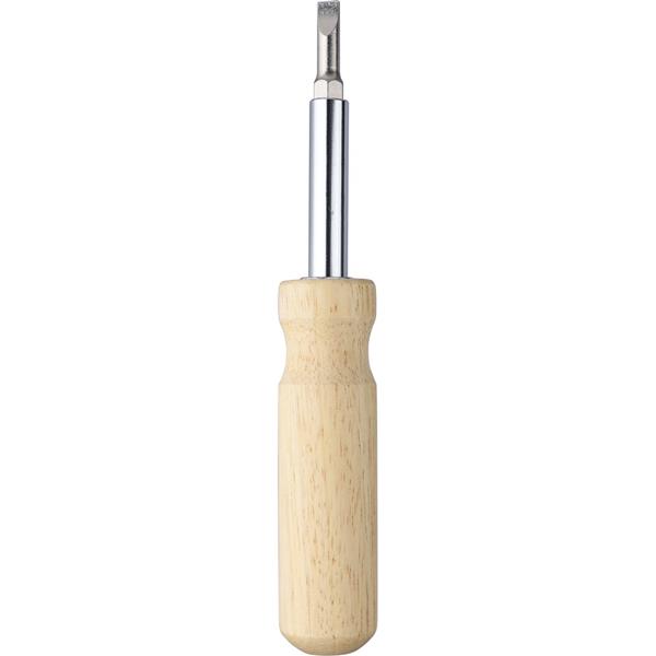 Śrubokręt z czterema podwójnymi magnetycznymi końcówkami, zapakowany w brązowe kartonowe pudełko, produkt wykonany z metalu i drewna kauczukowego