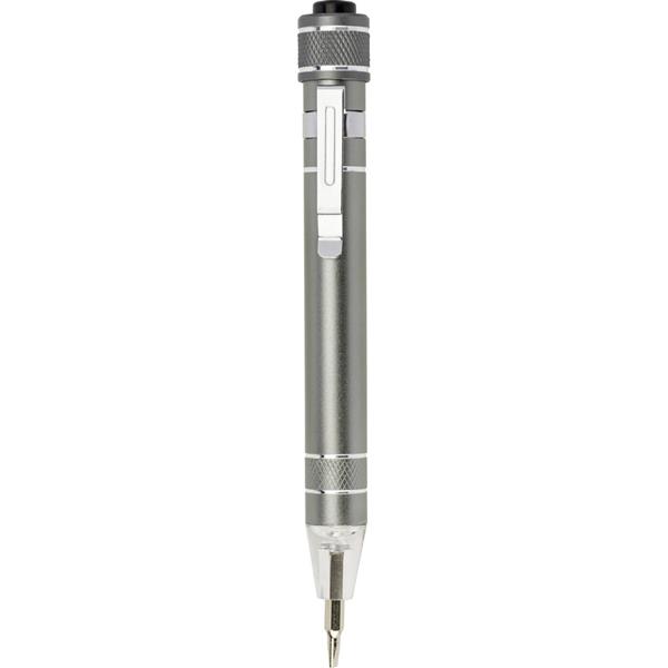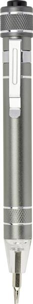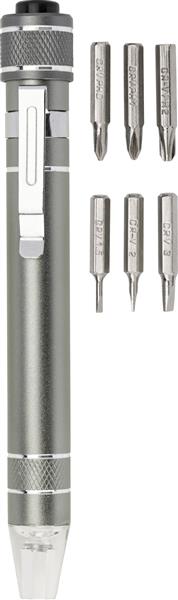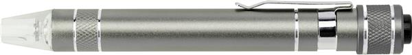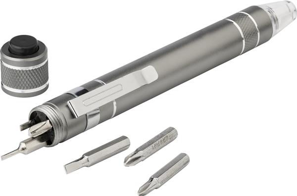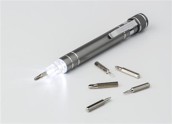 Śrubokręt w kształcie długopisu z lampką LED i końcówkami: 3 płaskie i 3 krzyżakowe
