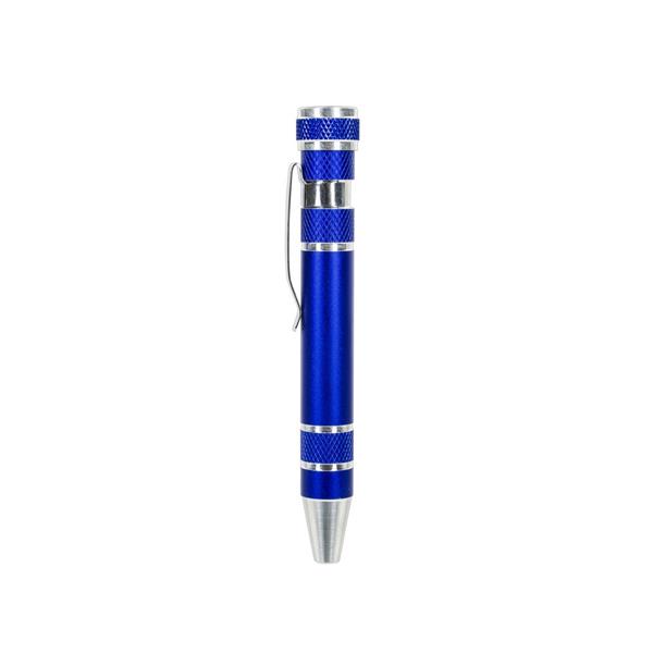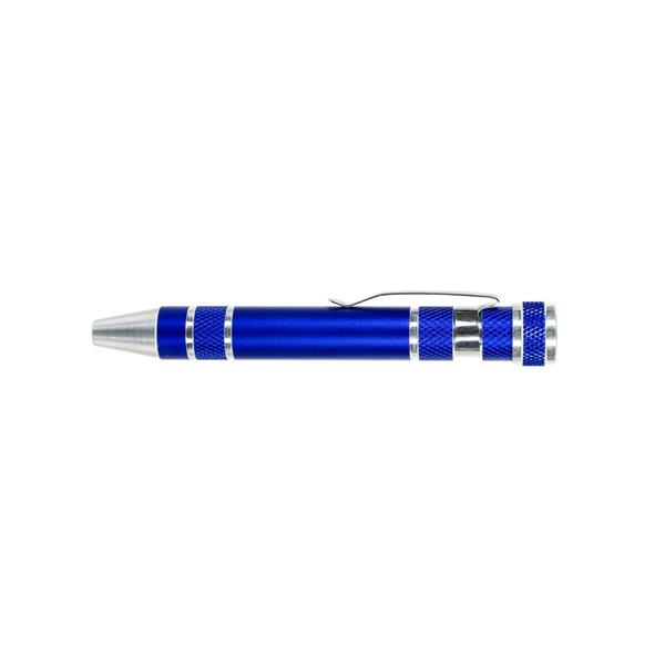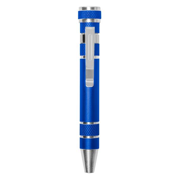 Śrubokręt w kształcie długopisu z 4 płaskimi i 4 krzyżakowymi końcówkami, posiada klip umożliwiający przypinanie, produkt wykonany z aluminium i stali
