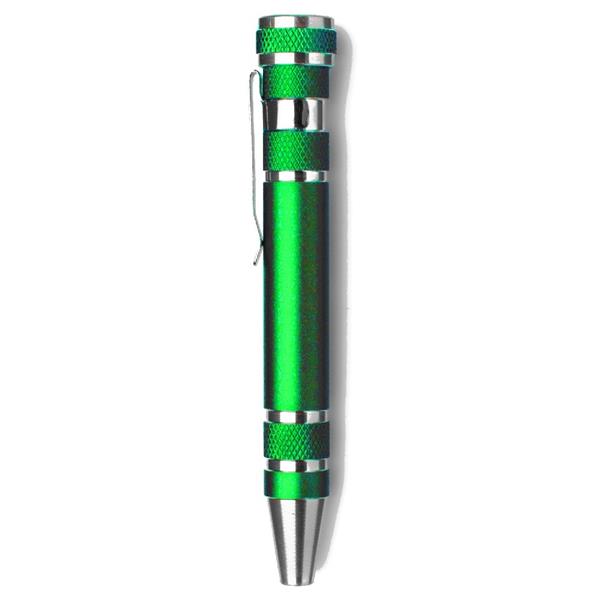 Śrubokręt w kształcie długopisu z 4 płaskimi i 4 krzyżakowymi końcówkami, posiada klip umożliwiający przypinanie, produkt wykonany z aluminium i stali