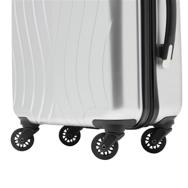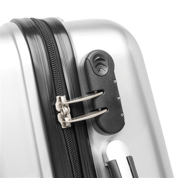 Walizka ST. TROPEZ z miejscem do pakowania po obu stronach. Wewnątrz podszewka, przegroda, pasek do pakowania, wysuwana rączka, 2 uchwyty, 4 nóżki, 4 kółka, zamek szyfrowy. Rozmiar odpowiedni dla tanich linii lotniczych. Materiał: Poliwęglan/Miks z tworzywem ABS Kolor: srebrny Tagi: Wózki,walizki,bagaże,akcesoria podróżne