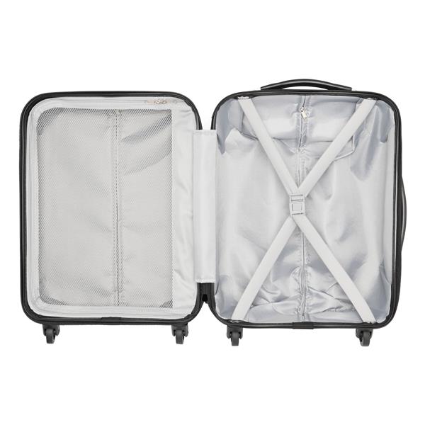 Walizka ST. TROPEZ z miejscem do pakowania po obu stronach. Wewnątrz podszewka, przegroda, pasek do pakowania, wysuwana rączka, 2 uchwyty, 4 nóżki, 4 kółka, zamek szyfrowy. Rozmiar odpowiedni dla tanich linii lotniczych.