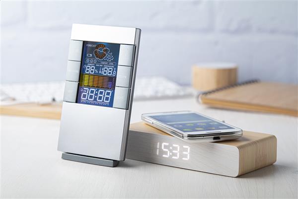 Cyfrowy zegar i stacja pogodowa z kolorowym wyświetlaczem. Funkcje: alarm, pomiar wilgoci i temperatury.