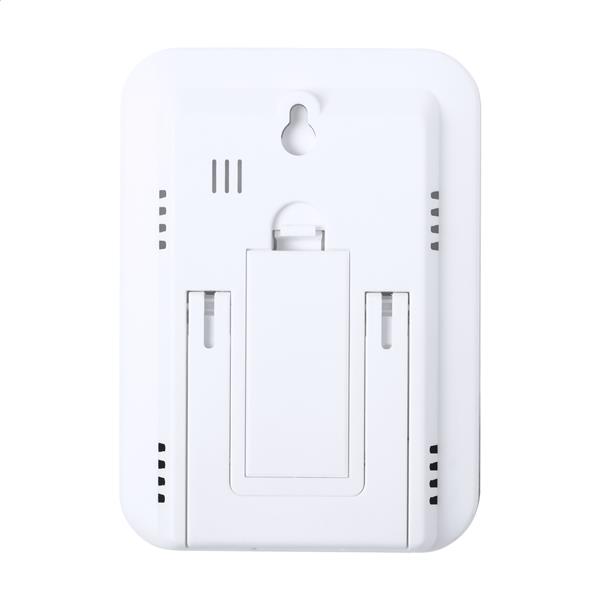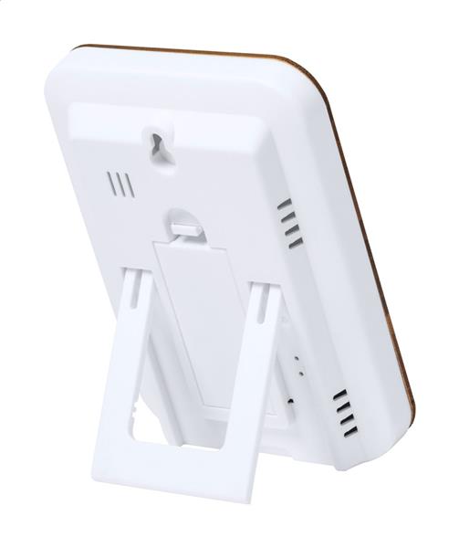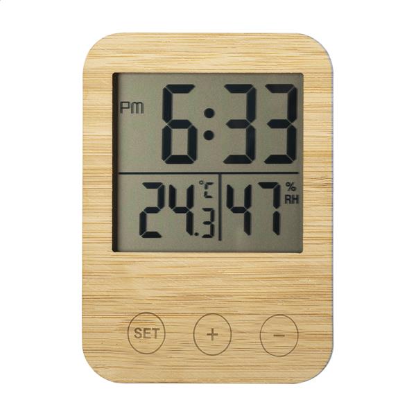 Bambusowy zegarek biurkowy ze stacją pogodową (wyświetla temperaturę i wilgotność). Zasilany 2 bateriami AAA. Brak baterii w zestawie.