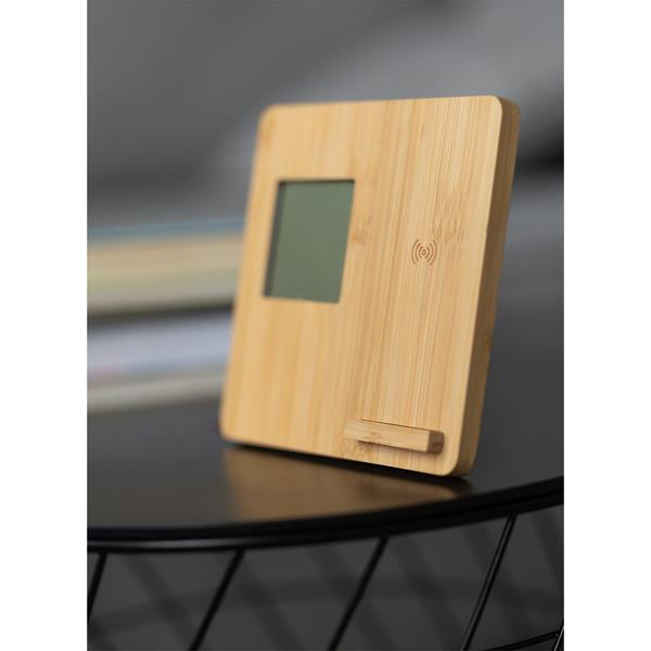Ładowarka bezprzewodowa w bambusowej obudowie o mocy 10W z podstawką pod telefon. Duży przejrzysty wyświetlacz poinformuje nas o godzinie, temperaturze i wilgotności otoczenia. Kabel USB w komplecie. W zestawie 1 bateria CR2032.
