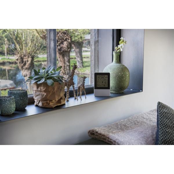 Stacja pogodowa z ekranem LCD, posiada czujnik zewnętrzny, funkcje: zegar, kalendarz, temperatura wewnątrz i na zewnątrz, prognoza pogody, wilgotność, budzik, ślad węglowy produktu: 1,67 kg CO2