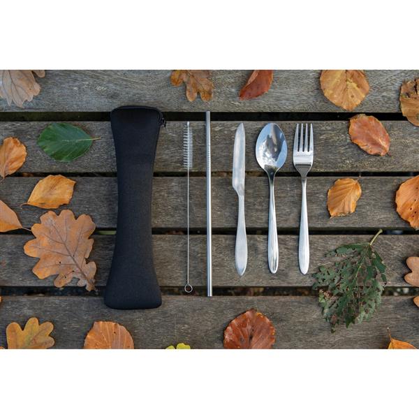 Zestaw sztućców 5 el., wykonane ze stali nierdzewnej, w komplecie nóż, widelec, łyżka, słomka i szczotka, z pokrowcu z neoprenu, ślad węglowy produktu: 1,01 kg CO2