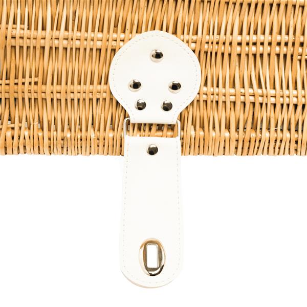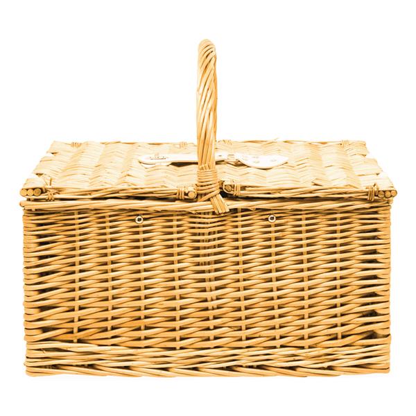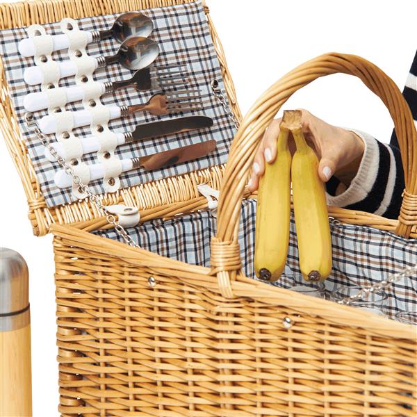 Wiklinowy koszyk piknikowy STANLEY PARK dla czterech osób. Zawiera sztućce ze stali nierdzewnej z plastikowymi rączkami, ceramiczne talerze, szklanki, serwetki oraz nóż kelnerski, z wewnętrznymi paskami mocującymi. Kosz z uchwytem i zamknięciem typu twist.