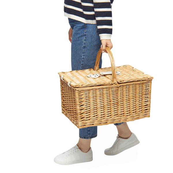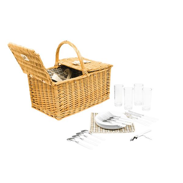 Wiklinowy koszyk piknikowy STANLEY PARK dla czterech osób. Zawiera sztućce ze stali nierdzewnej z plastikowymi rączkami, ceramiczne talerze, szklanki, serwetki oraz nóż kelnerski, z wewnętrznymi paskami mocującymi. Kosz z uchwytem i zamknięciem typu twist. Materiał: Drewno/Ceramika/Szkło/Plastik/Poliestere Kolor: brązowy Tagi: Akcesoria piknikowe,outdoor,artykuły rekreacyjne,akcesoria do grilla,artykuły gospodarstwa domowego
