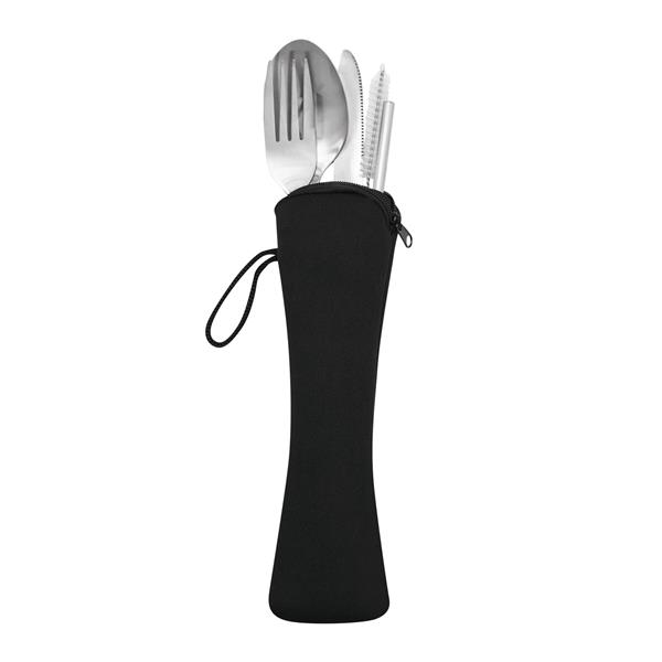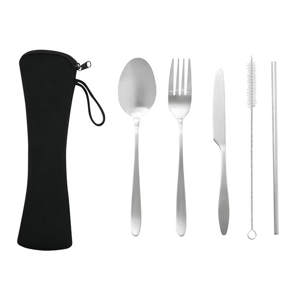 Zestaw sztućców ze stali nierdzewnej STELLOKIT, 5 elementów. Zestaw zawiera nóż, widelec, łyżkę, słomkę do napojów oraz szczoteczkę do łatwego czyszczenia słomki. Wszystko w małej neoprenowej torbie z zamkiem błyskawicznym i uchwytem do przenoszenia.