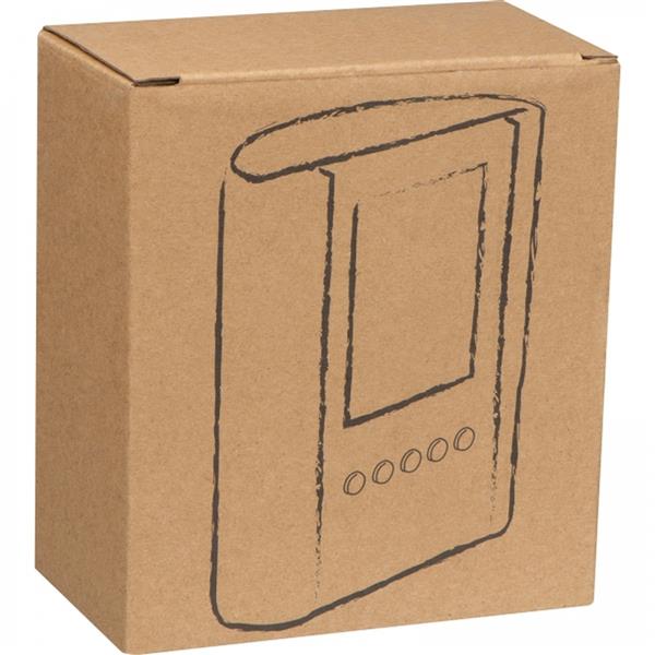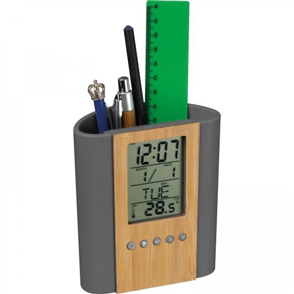 Stojak biurkowy na długopisy z bambusowym frontem i wbudowanym zegarem elektronicznym, posiadającym wiele funkcji, takich jak: zegar, minutnik, budzik, kalendarz, termometr oraz przypominanie o urodzinach.