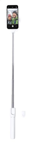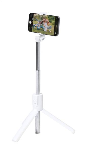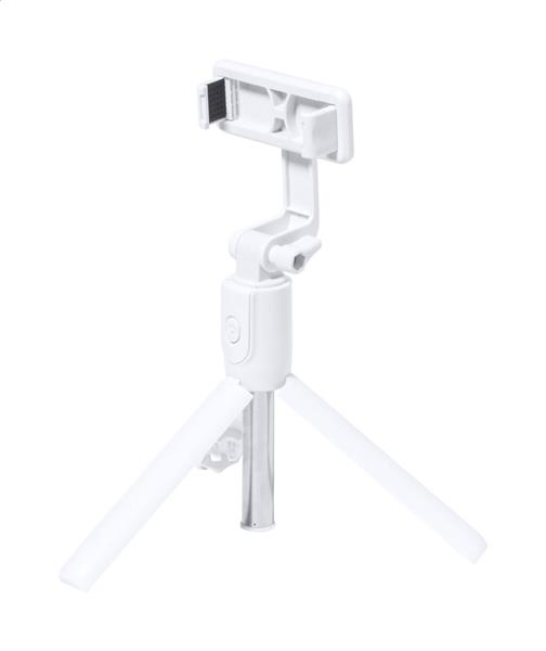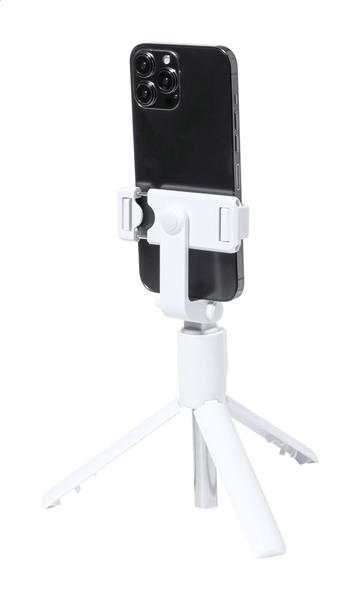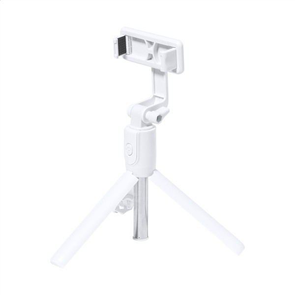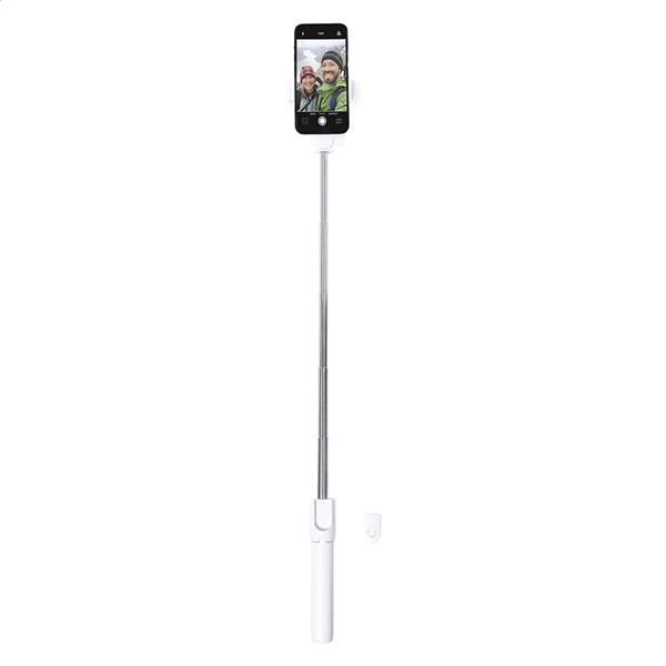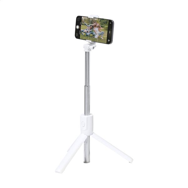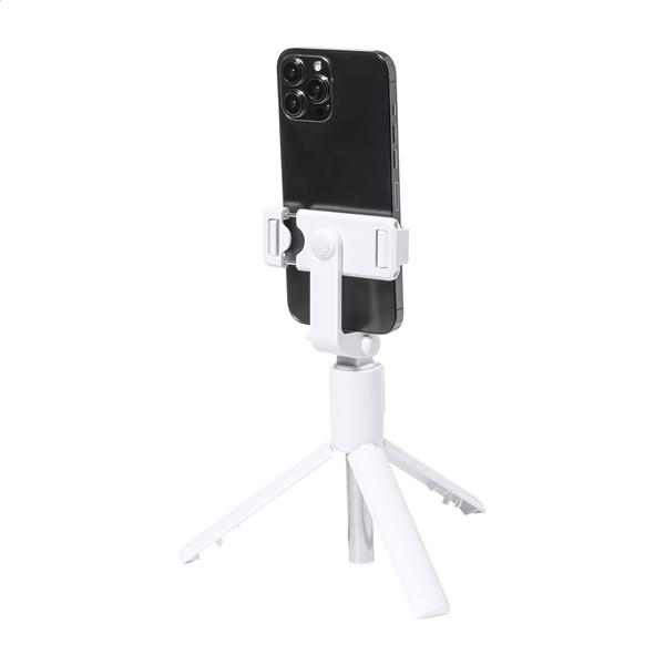 Składany statyw i selfie stick z tworzywa ABS i stali nierdzewnej z regulowanym uchwytem na telefon komórkowy. W zestawie bezprzewodowy pilot zdalnego sterowania.