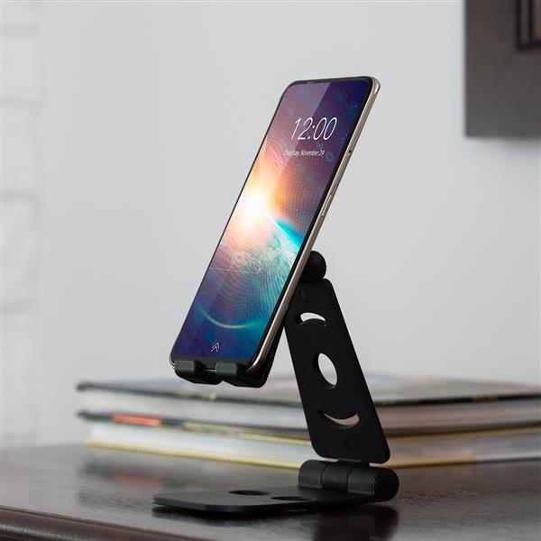 Składana i regulowana podstawka do telefonu komórkowego stworzona z myślą o bezproblemowym korzystaniu ze smartfona w trakcie tele i wideokonferencji. Przemyślana ażurowa konstrukcja pozwala na podpięcie ładowarki od dołu podczas gdy telefon pozostaje stabilny ustawiony w pozycji pionowej. Nieużywana składa się do poręcznych rozmiarów. Telefon nie jest dołączony.